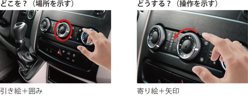 「場所の特定」では操作対象のツマミがどこにあるかを見せる必要があります。そのため、全体像が分かりづらい”寄り絵”より、全体が見える”引き絵”の方がユーザーは場所を特定しやすくなります。その際に補足として罫囲みなどのグラフィックを併用するとさらに伝わりやすくなります。